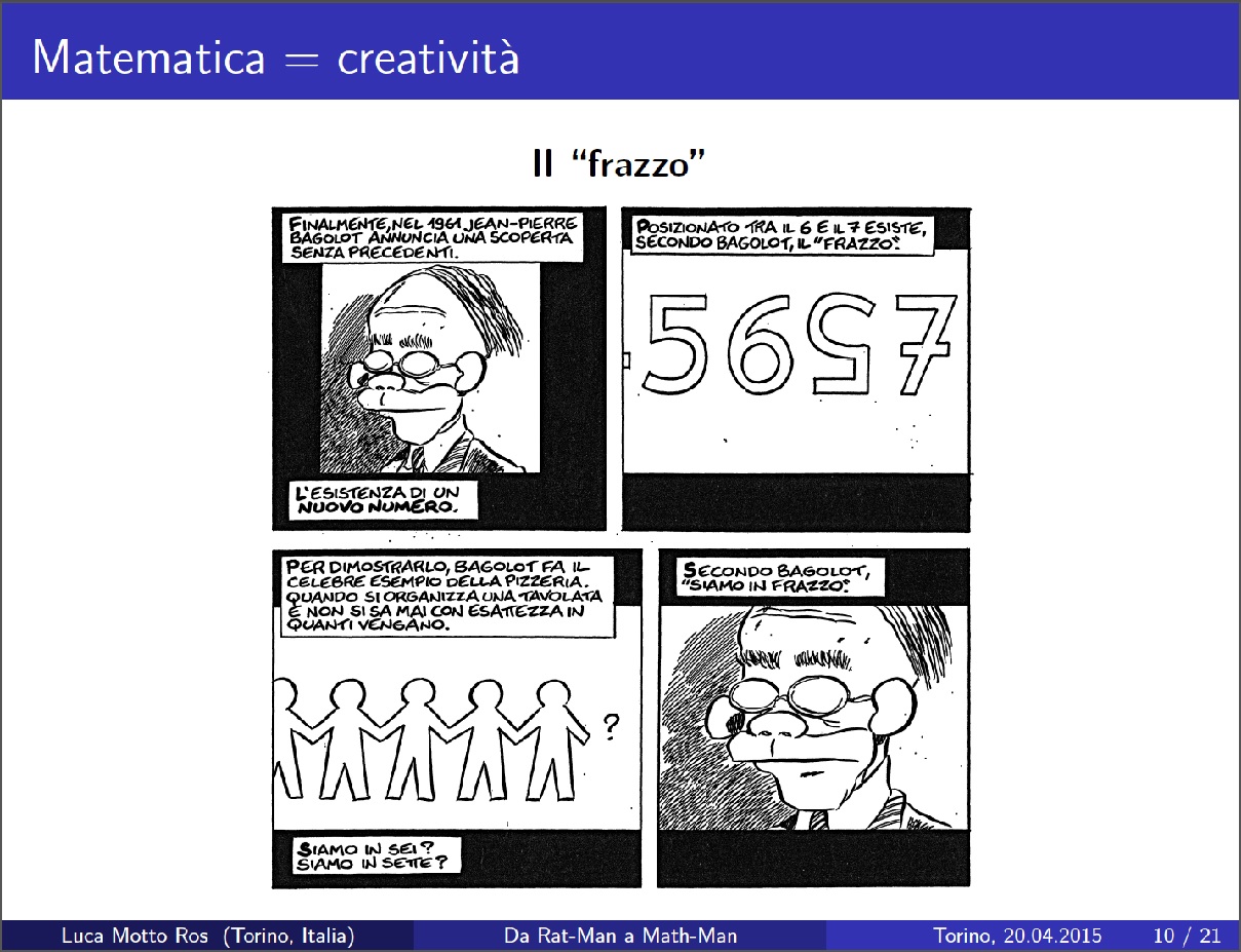 Dopo i saluti istituzionali, il matematico Luca Motto Ros ha tenuto un’interessante conferenza di carattere divulgativo, in cui ha trattato alcuni dei numerosi temi matematici citati nel fumetto. Tra gli altri, la macchina di Turing (non un’automobile, ovviamente, ma un modello teorico di computer elaborato da Alan Turing nel 1936), lo smorzamento di Landau, il numero “frazzo” (ovvero, le estensioni degli insiemi numerici, vedi la Foto 3), Kurt Gödel e il problema dei fondamenti della matematica, i cosiddetti “problemi del millennio”.