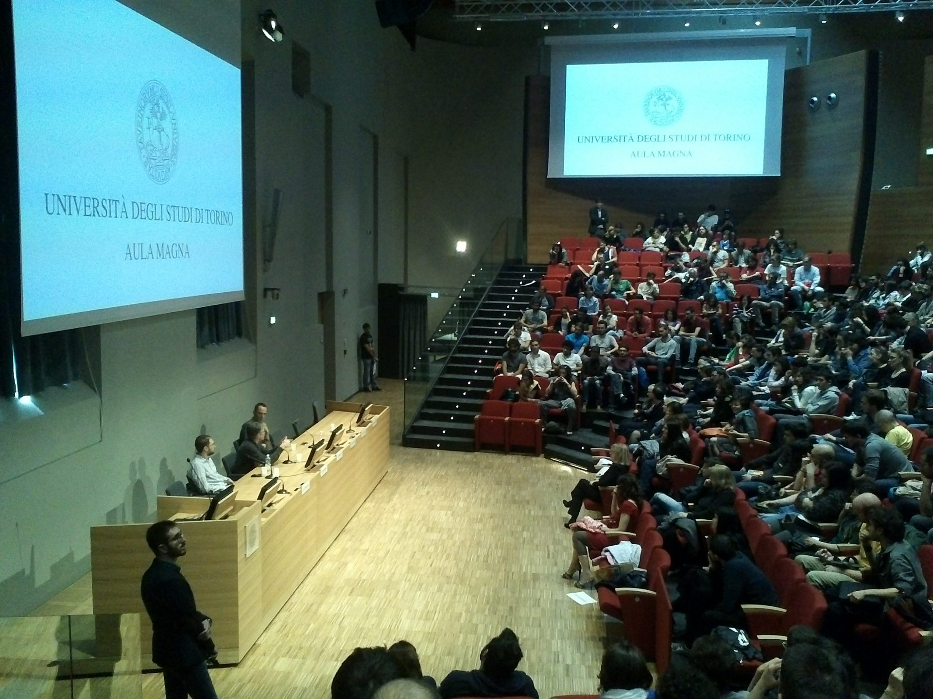 Un pomeriggio di aprile. Una sala piena di appassionati e curiosi. Poi azione, divertimento, battute fulminanti, ed un pubblico che se ne va soddisfatto. Non stiamo parlando dell’uscita al cinema di “Avengers: Age of Ultron”, ma dell’evento “Da Rat-man a Math-man. Un incontro di divulgazione matematica con Leo Ortolani”, che si è svolto lunedì 20 aprile presso l’Aula Magna dell’Università di Torino alla Cavallerizza Reale. L’incontro è stato organizzato dal Dipartimento di Matematica “Giuseppe Peano” dell’Università degli Studi di Torino, a cura di M. Borsero, S. Coriasco, L. Corradetti, C. Dagnino, in collaborazione con IAC-CNR, Lucca Comics&Games, Comics&Science e Symmaceo Communications. Reportage di M.B. & S.C. per MaddMaths!.