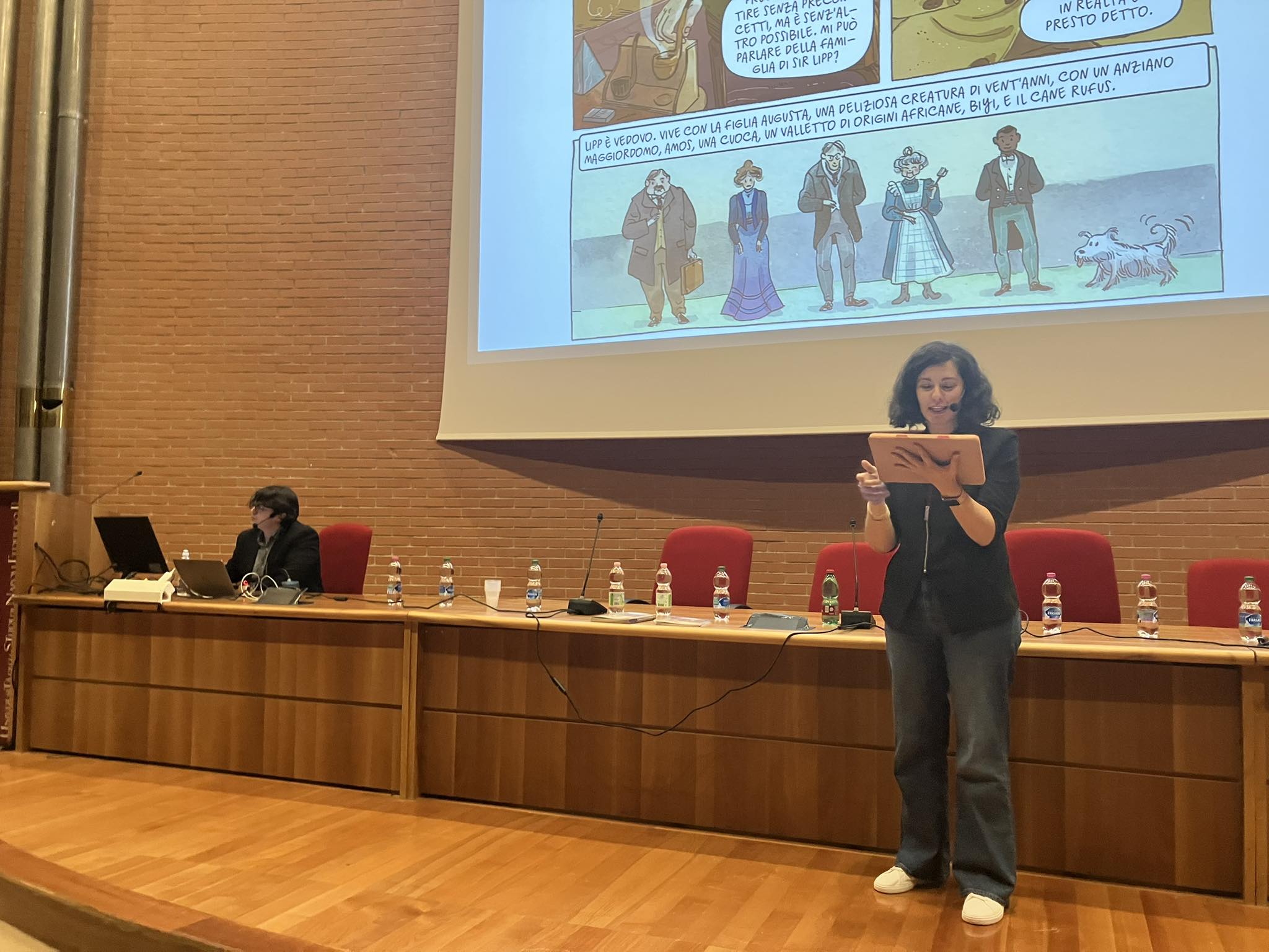 Dopo tanto entusiasmo per le tre storie narrate, era naturale attendersi una caduta di attenzione, brillantemente evitata da una chiusura scoppiettante. Il comitato organizzatore ha tirato fuori dal cilindro una trovata che ha catturato il pubblico ammutolendolo: la lettura teatrale di un fumetto a cura dell’attrice Rossella Rivoli e l’attore Giovanni Amura, volti noti al pubblico napoletano e non solo, quest’ultimo anche per la partecipazione alla serie tv “L’amica geniale”. L’albo, che fa parte di Comics&Science, pubblicato da Cnr Edizioni, si intitola Cherchez, les femmes! ed è sceneggiato da Susanna Raule e disegnato da Sara Menetti che è intervenuta di persona assieme a Sara Bonella del CECAM-Politecnico Federale di Losanna, committente del fumetto stesso, contribuendo con i suoi disegni dal vivo durante tutto il corso della mattinata. Il racconto di Bonella e Menetti del percorso fatto per l’ambientazione del fumetto, la creazione dei personaggi, lo sviluppo delle bozze e la realizzazione definitiva ha concluso la mattinata, al termine della quale è stato consegnato come ricordo a ciascun partecipante una copia del fumetto realizzata appositamente per l’occasione.