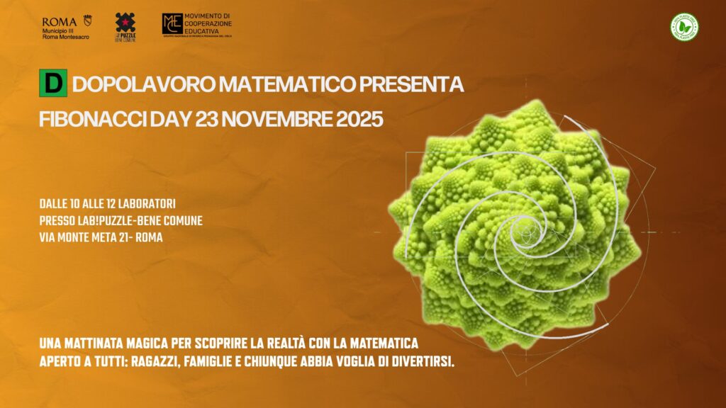 In occasione del Fibonacci Day che ricorre ogni anno il 23 novembre, le attiviste e gli attivisti del Dopolavoro Matematico di Roma, insieme alle educatrici e agli educatori della Scuola Popolare Carla Verbano, ti aspettano per una mattinata di laboratori interattivi e curiosità matematiche presso Lab!Puzzle – Bene Comune. Sarà un’occasione per scoprire o riscoprire la bellezza della matematica che vive intorno a noi!