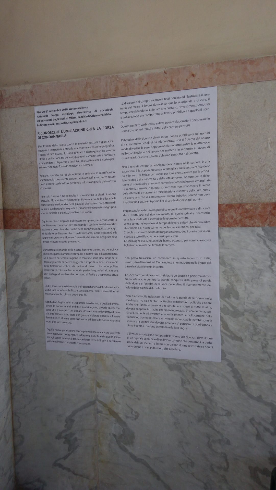 Un breve resoconto di un interessante convegno sulle molestie sessuali nell’ambito delle università e degli enti di ricerca organizzato dall’Associazione Donne&Scienza e da EPWS (European Platform of Women Scientist) che si è tenuto alla Cittadella Galileiana di Pisa il 20 e 21 settembre. Sia fra gli speakers che fra i partecipanti erano presenti vari matematici, fra cui Colette Guillopé (Universitè de Paris) e chi scrive. La prima delle tre sessioni è stata incentrata sulle conoscenze che abbiamo sul problema delle molestie sessuali: esperte di vari paesi europei (accademiche, ricercatrici presso enti di ricerca, consigliera di fiducia di vari atenei) hanno illustrato le differenze di atteggiamento e di percezione nei confronti di questi comportamenti, in parte dovute alle diversità culturali delle varie nazioni, e le criticità dei vari sistemi per la loro gestione. Nella seconda parte del convegno, gli interventi si sono focalizzati sulle possibili strategie di risoluzioni dei problemi e sono stati considerati diversi punti di vista, da quello più propriamente legale, grazie a un’avvocata inglese, a quello sociologico, con riferimenti all’attività di movimenti informali, fino ad arrivare alle esperienze concrete svolte in Olanda e in alcune università italiane. L’attenzione dell’ultima serie di relazioni si è appuntata sulle strategie di prevenzione: le presentazioni sono state di natura molto varia e stimolante, spaziando dalle misure di protezione e difesa in alcune università tedesche (Bochum, Konstanz) al ruolo e all’azione del consigliere di fiducia nelle istituzioni di ricerca (INGV, ISPRA), per finire con un resoconto, che ha compreso anche una descrizione del documentario Ms. Scientist, sulla pregevole esperienza canadese in materia di diversità di genere, di razza e di origine.